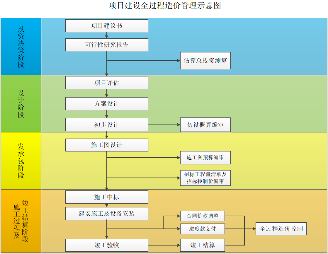 實(shí)踐中,建設(shè)工程全過程造價(jià)管理可以概括為貫穿于項(xiàng)目建設(shè)過程中的4個(gè)階段,分別為項(xiàng)目的決策階段、設(shè)計(jì)階段、發(fā)承包階段、施工過程以及竣工結(jié)算階段。
