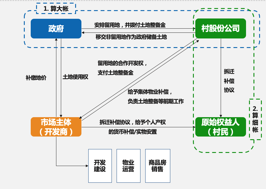 (3)留用土地由開(kāi)發(fā)商和村股份公司合作開(kāi)發(fā),開(kāi)發(fā)商補(bǔ)繳地價(jià)后負(fù)責(zé)項(xiàng)目范圍的征地拆遷、土地平整以及留用地的開(kāi)發(fā)建設(shè)、物業(yè)運(yùn)營(yíng)和商品房銷(xiāo)售等,而村股份公司可按照留用地土地價(jià)值占比參與開(kāi)發(fā)收益分成。非留用地全部移交政府管理,作為政府儲(chǔ)備用地,后續(xù)可用于基礎(chǔ)設(shè)施建設(shè)或土地出讓。
