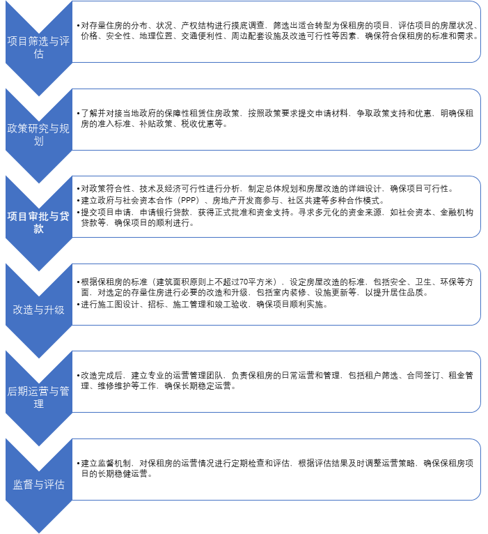 存量房屋改造為保租房的項(xiàng)目是一個(gè)涵蓋多個(gè)關(guān)鍵環(huán)節(jié)的系統(tǒng)性過(guò)程: